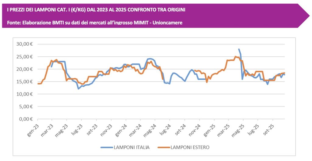Over the past three years, the price of raspberries, both Italian and foreign, has remained in the range of 15 Euros/kg to 20 Euros/kg, but there have been peaks of over 25 Euros/kg, as in the spring of last year; in the first ten days of November, prices for domestic product were around 18 Euros/kg.