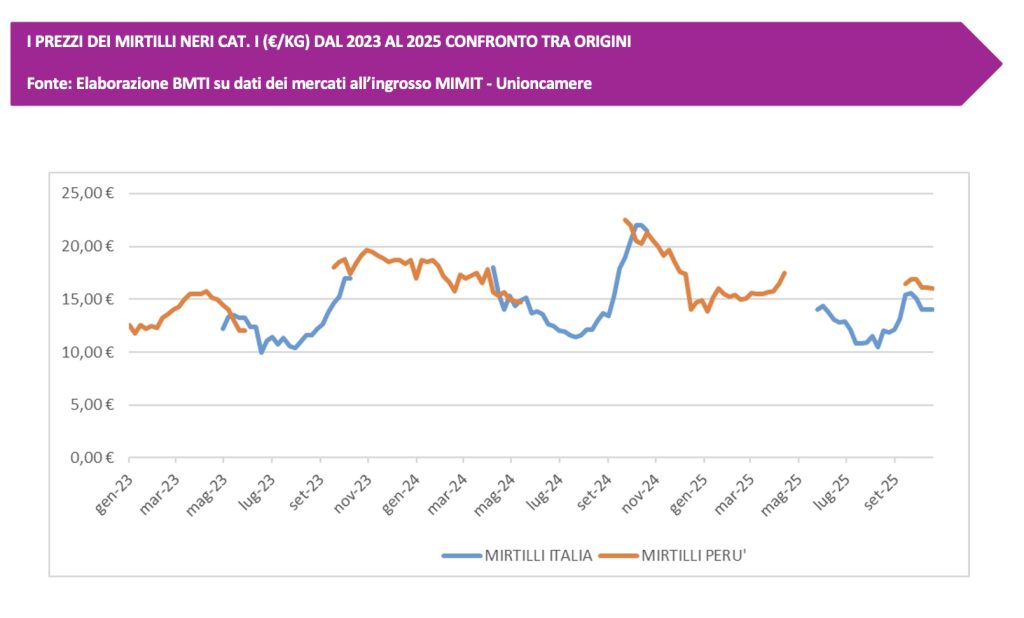 Domestic blackberries are available from spring to late autumn, favored by the mild climate of recent years, with prices ranging between 10 Euros/kg and 15 Euros/kg. During the winter, both European and overseas product (from Chile, Mexico, Peru) are available, with prices approaching 20 Euros/kg.