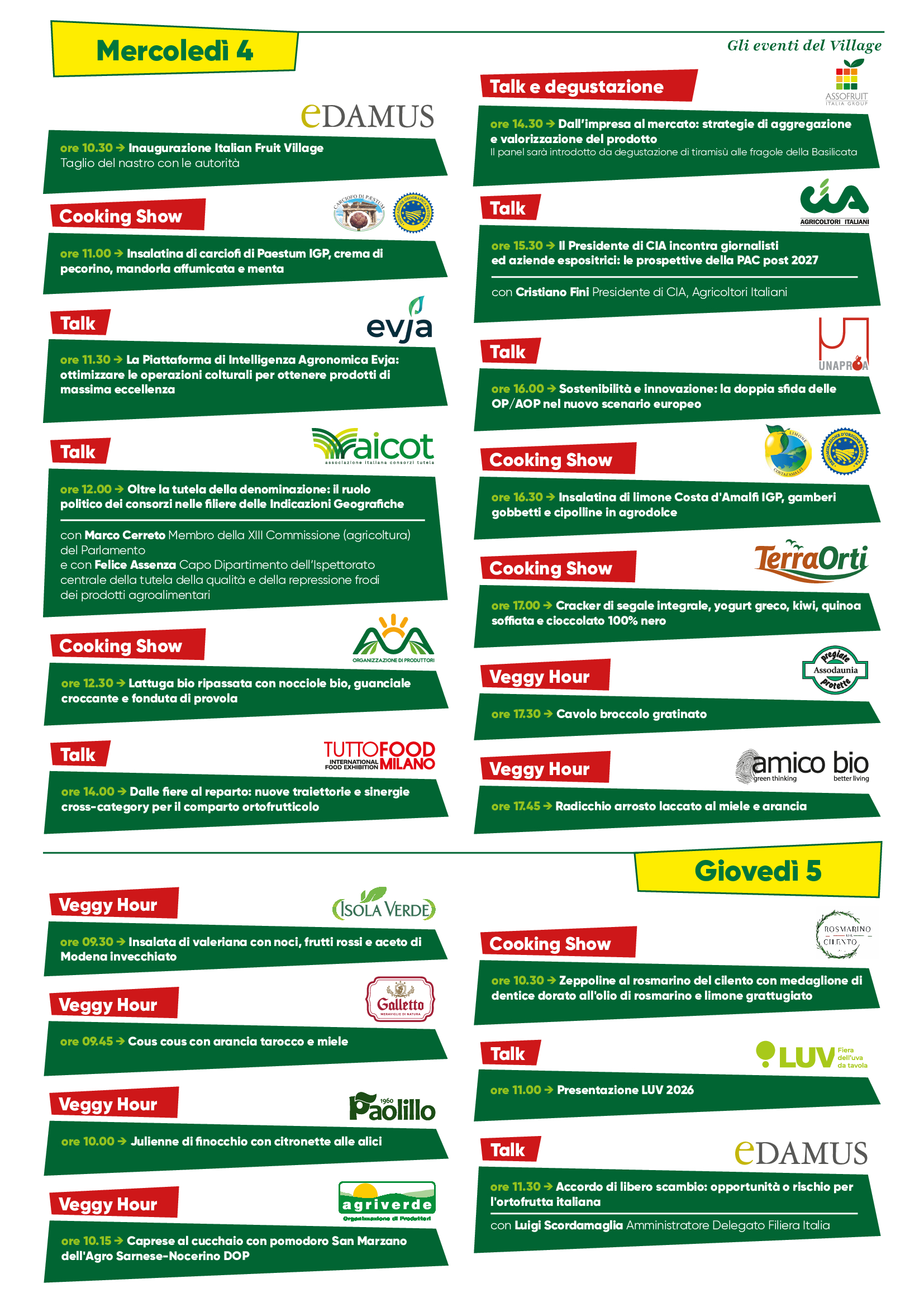 Dal palco dell’Italian Fruit Village spazio anche alla promozione di tre importanti eventi dedicati all’agroalimentare: le edizioni 2026 di Tuttofood (Milano 11-14 maggio), del Salone della Dieta Mediterranea Dmed (Napoli 11-13 giugno) e di Luv-la fiera dell’uva da tavola (Bari 20-22 ottobre).