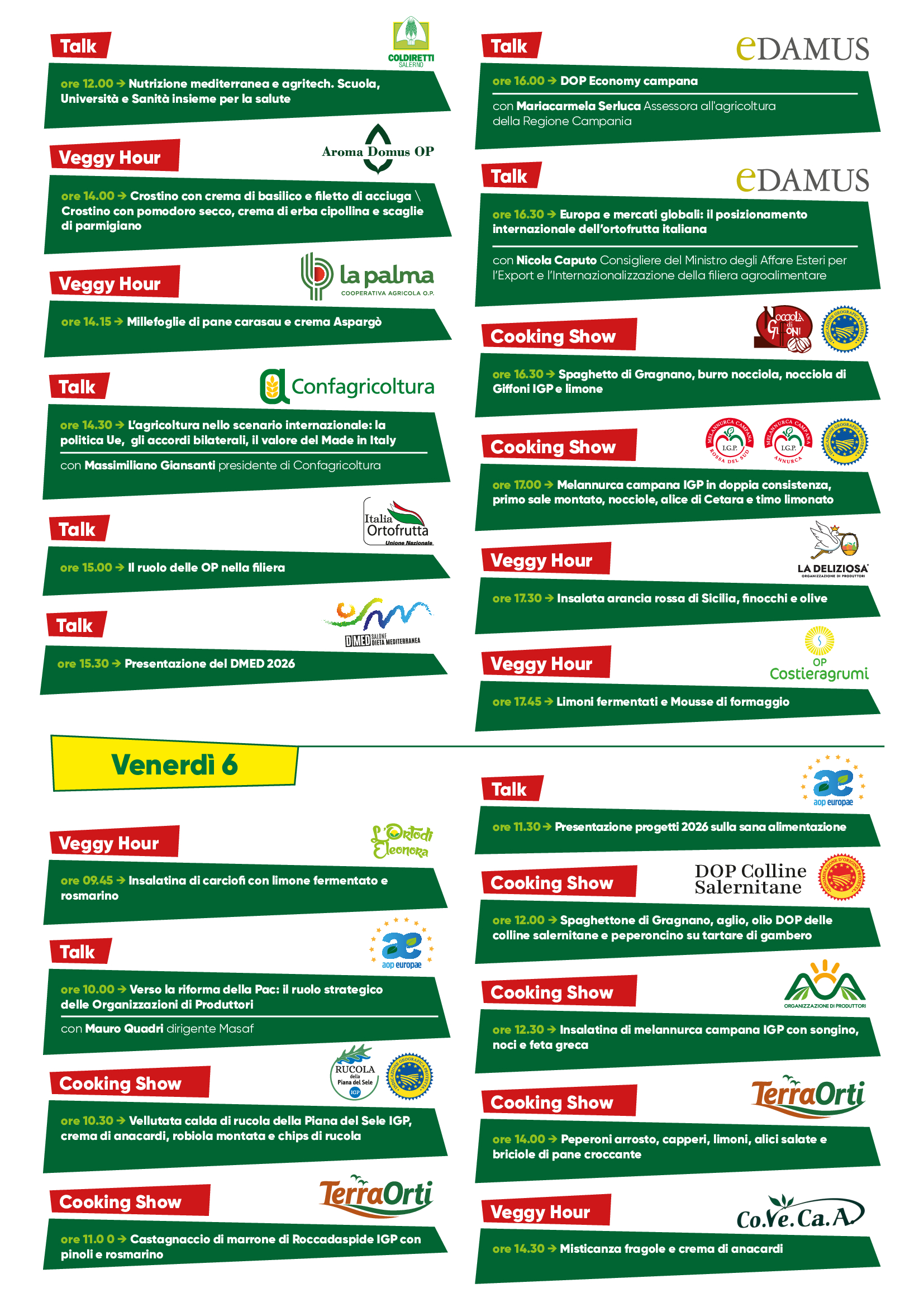 Previsti cooking-show e Veggy hour durante i quali il resident chef di Ifv, Mimmo Esposito, proporrà ricette salutari e innovative attraverso l’utilizzo dei prodotti messi a disposizione dalle aziende, Organizzazione di produttori e Consorzi di tutela: Aoa, Agriverde, Amico Bio, Aroma Domus, Assodaunia, Campidanese, Co.Ve.Ca.A., Consorzio di Tutela della Melannurca Campana Igp, Consorzio di Tutela della Nocciola di Giffoni Igp, Consorzio di Tutela Olio Colline Salernitane Dop, Costieragrumi, Il Galletto, Isola Verde, La Deliziosa, La Palma, Marrone di Roccadaspide, Paolillo, Terra Orti.