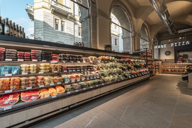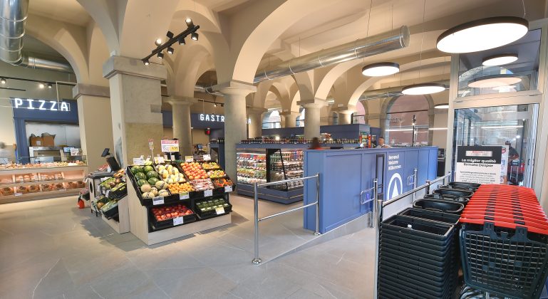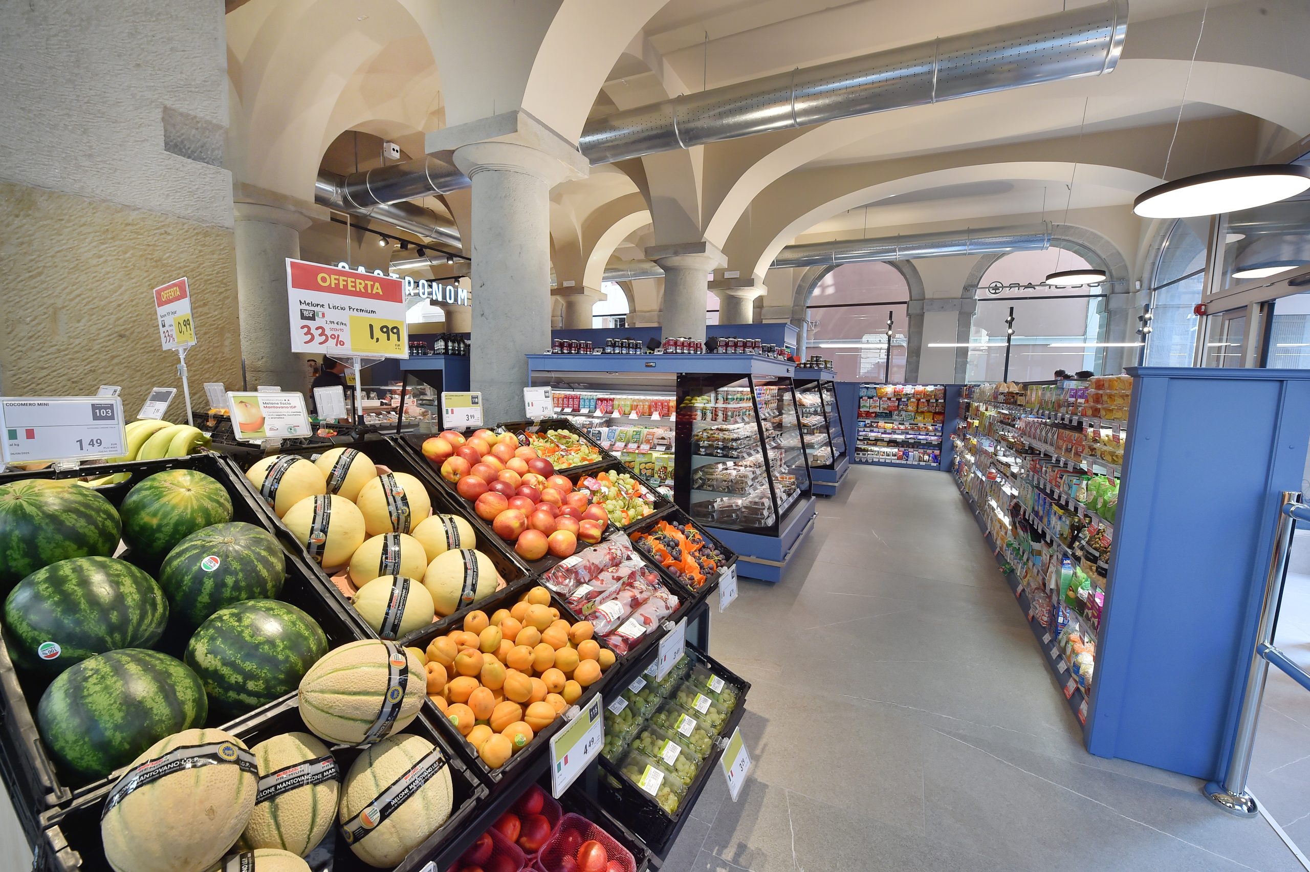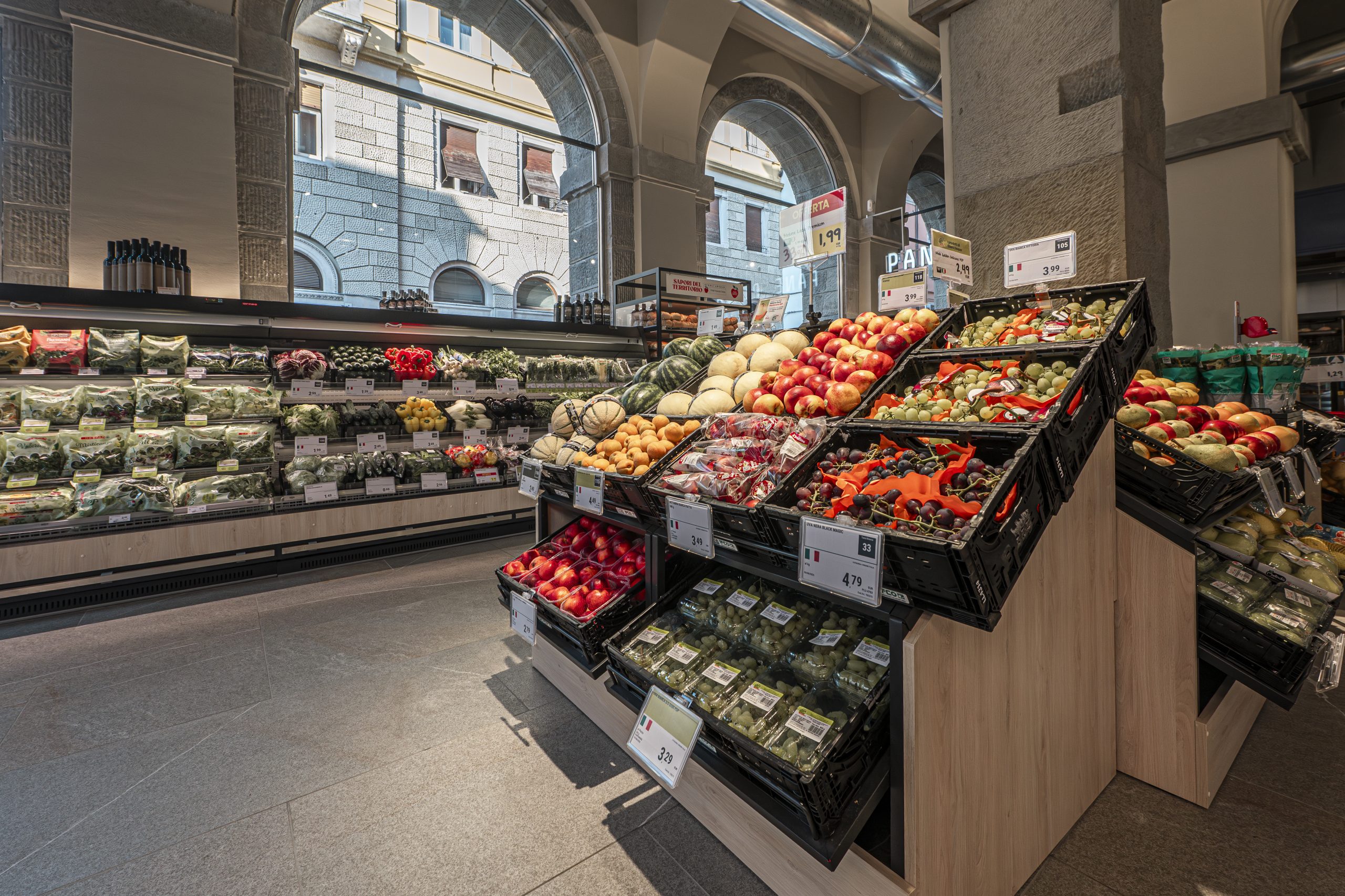 Il supermercato occupa una superficie di vendita di 250 mq ed è dotato di innovative soluzioni impiantistiche a basso impatto ambientale ed elevato risparmio energetico. Tutti gli scaffali espositivi hanno un’altezza che consente di avere una completa panoramica del punto di vendita e si incardinano perfettamente nell’ambiente storico che le ospita, ortofrutta compresa.